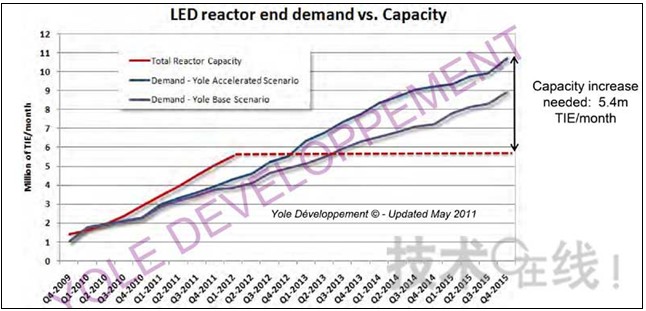 Yole Developpement預測2012年1月到2015年12月LED企業(yè)需要增加MOCVD設備并增強540萬枚的產能(按2英寸晶圓換算,TIE)